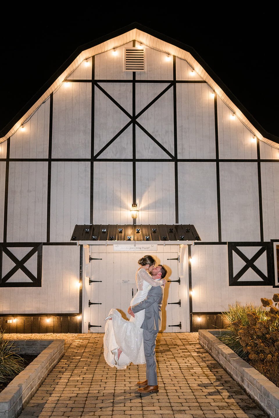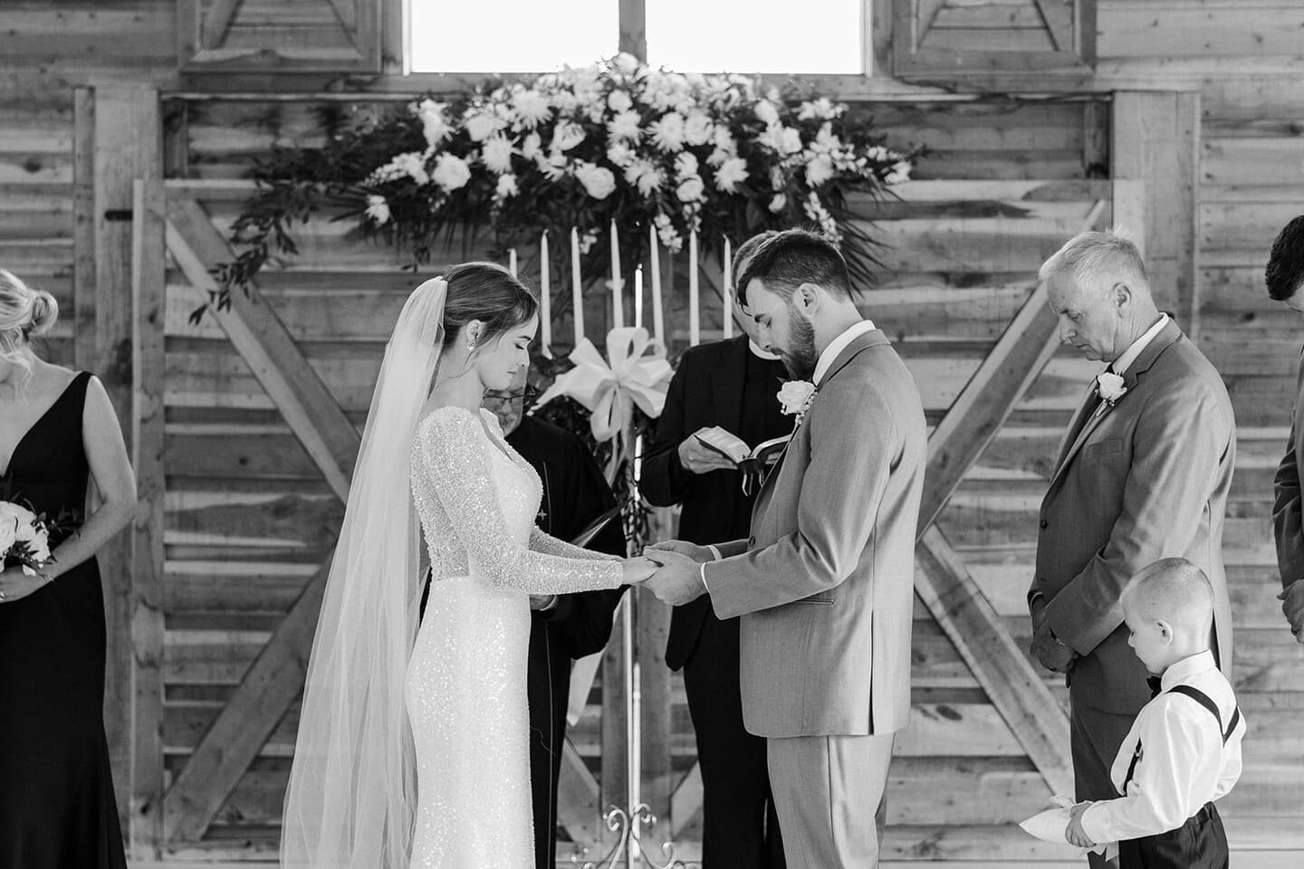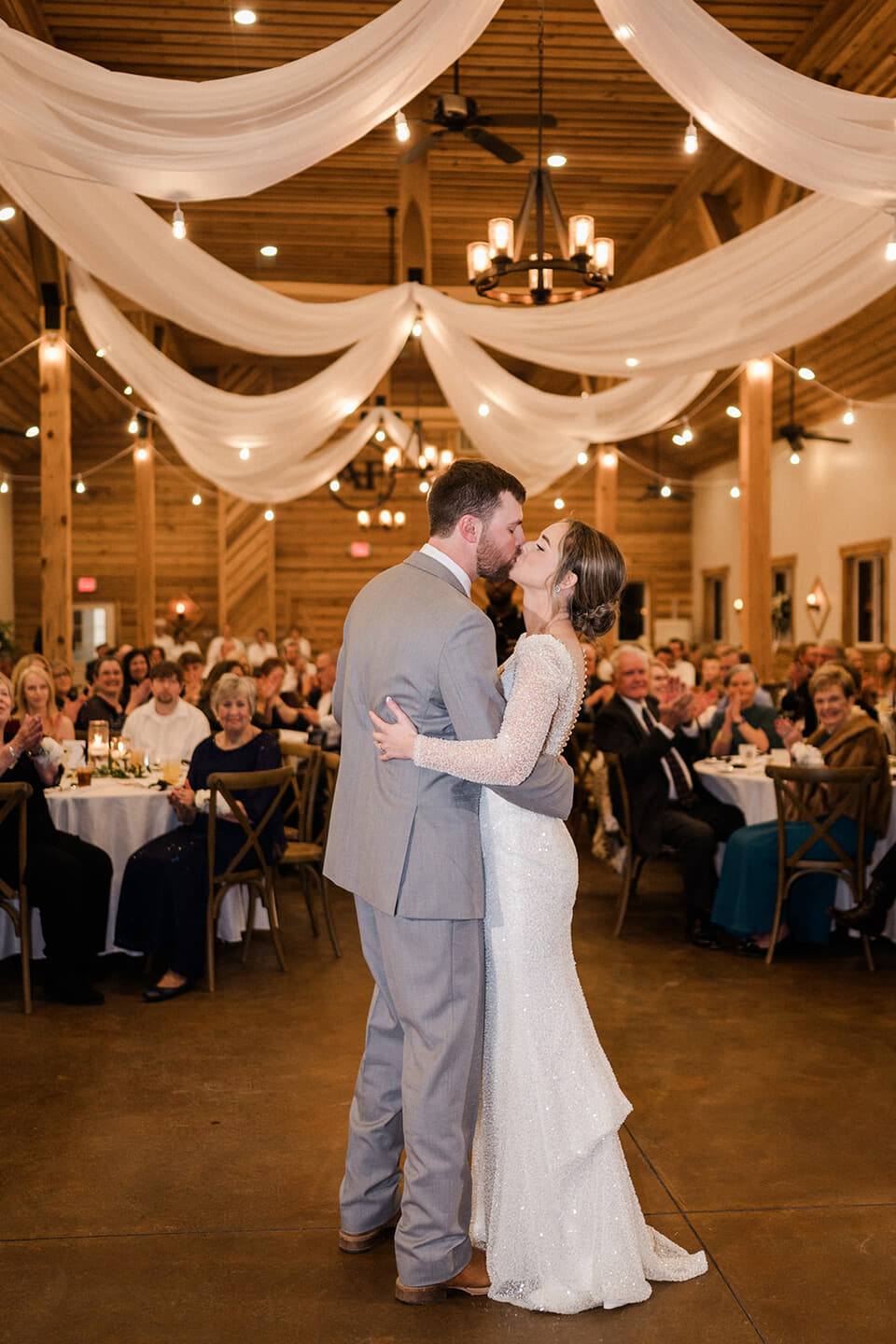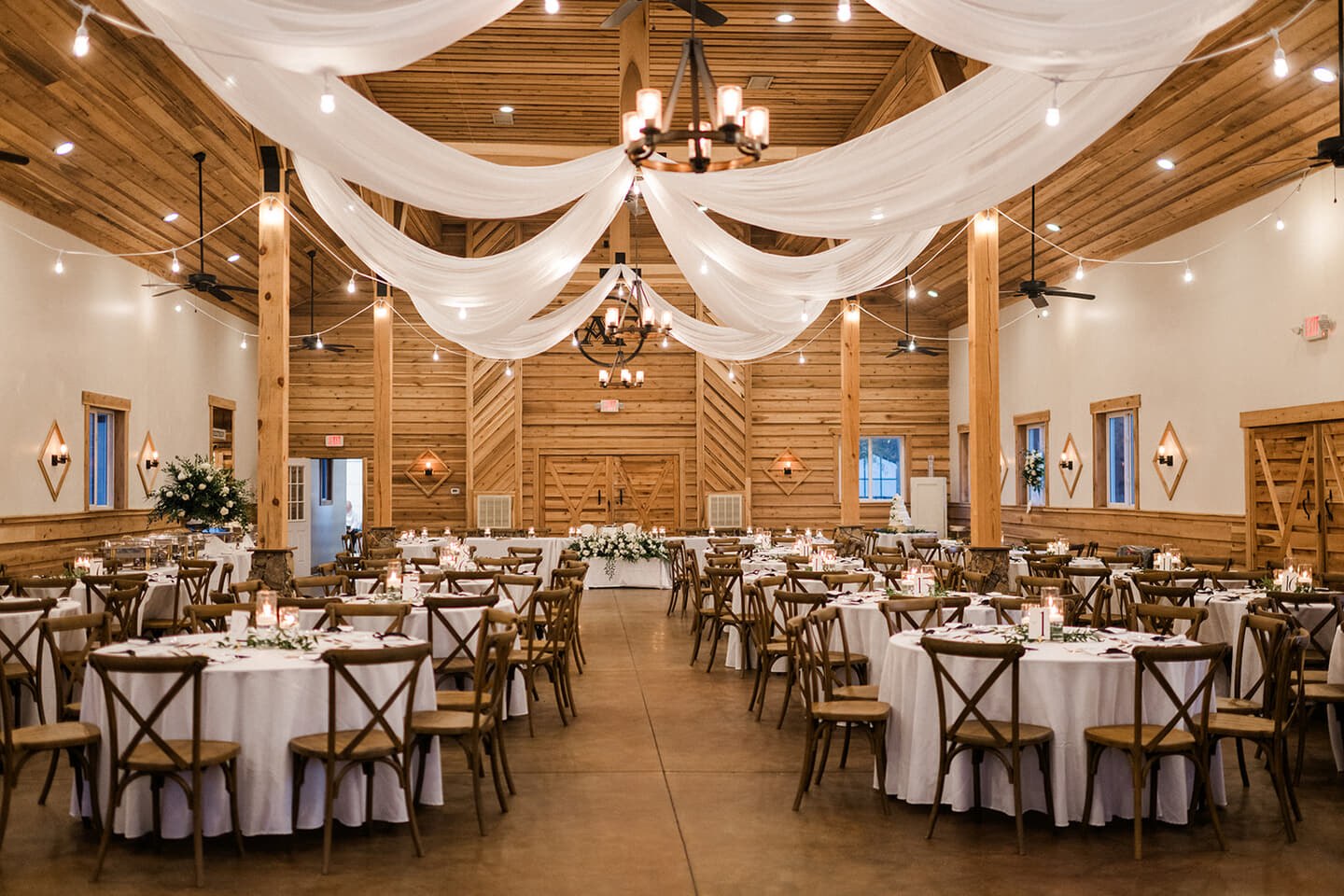 Inside the reception space, white drapery cascaded from the wooden beams, transforming the room into a dreamy farmhouse setting. Cross-back chairs, crisp linens, glowing candles, and lush white florals with greenery brought softness and warmth to the rustic interior. Music became one of the evening’s most memorable elements, as a live musician filled the space with heartfelt sound and even welcomed a young guest on stage, creating a moment guests won’t soon forget.