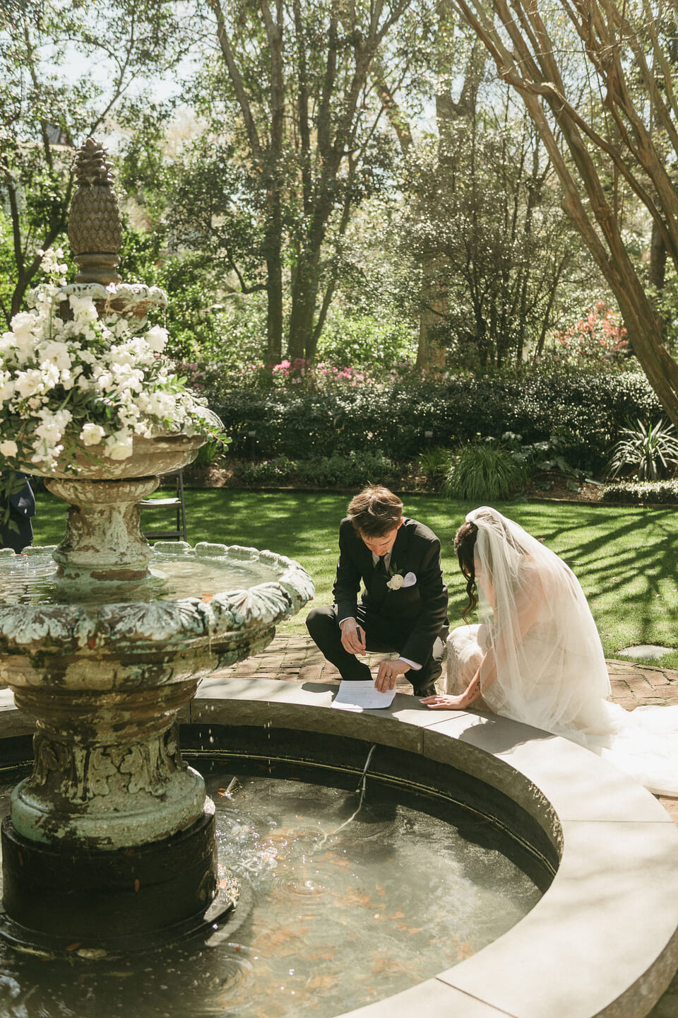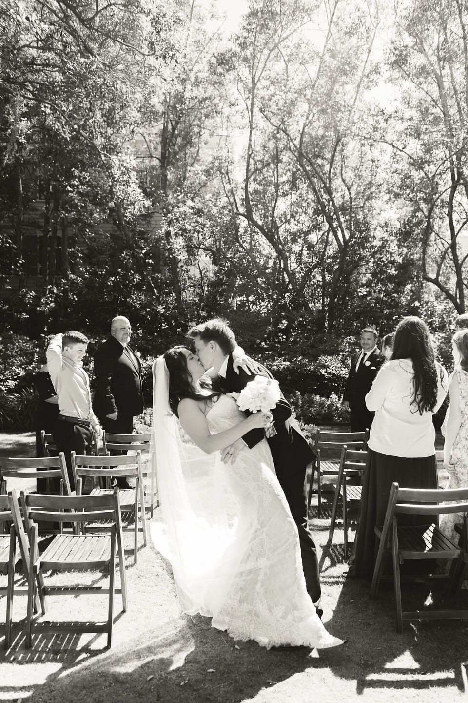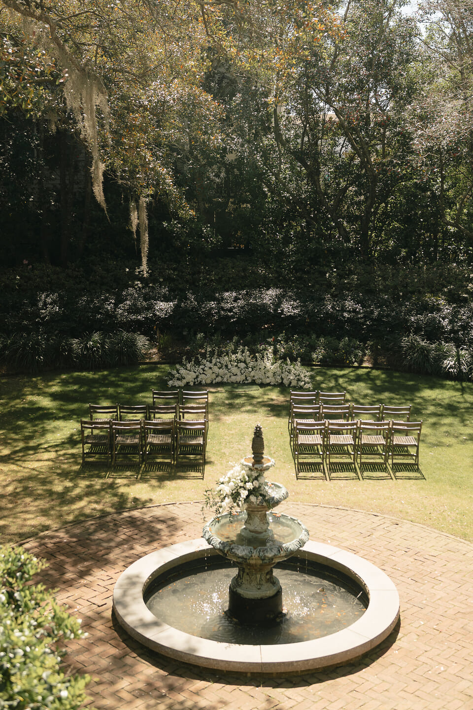 The ceremony took place beneath a white floral arch, framed by vintage wooden chairs and the gentle sound of the nearby fountain. Planned with care by A Knotch Above Events, the day unfolded with ease, allowing the couple’s connection to remain at the center. Reagan Aleea Photography preserved the celebration through luminous color and classic black and white imagery, capturing both emotion and intimacy.