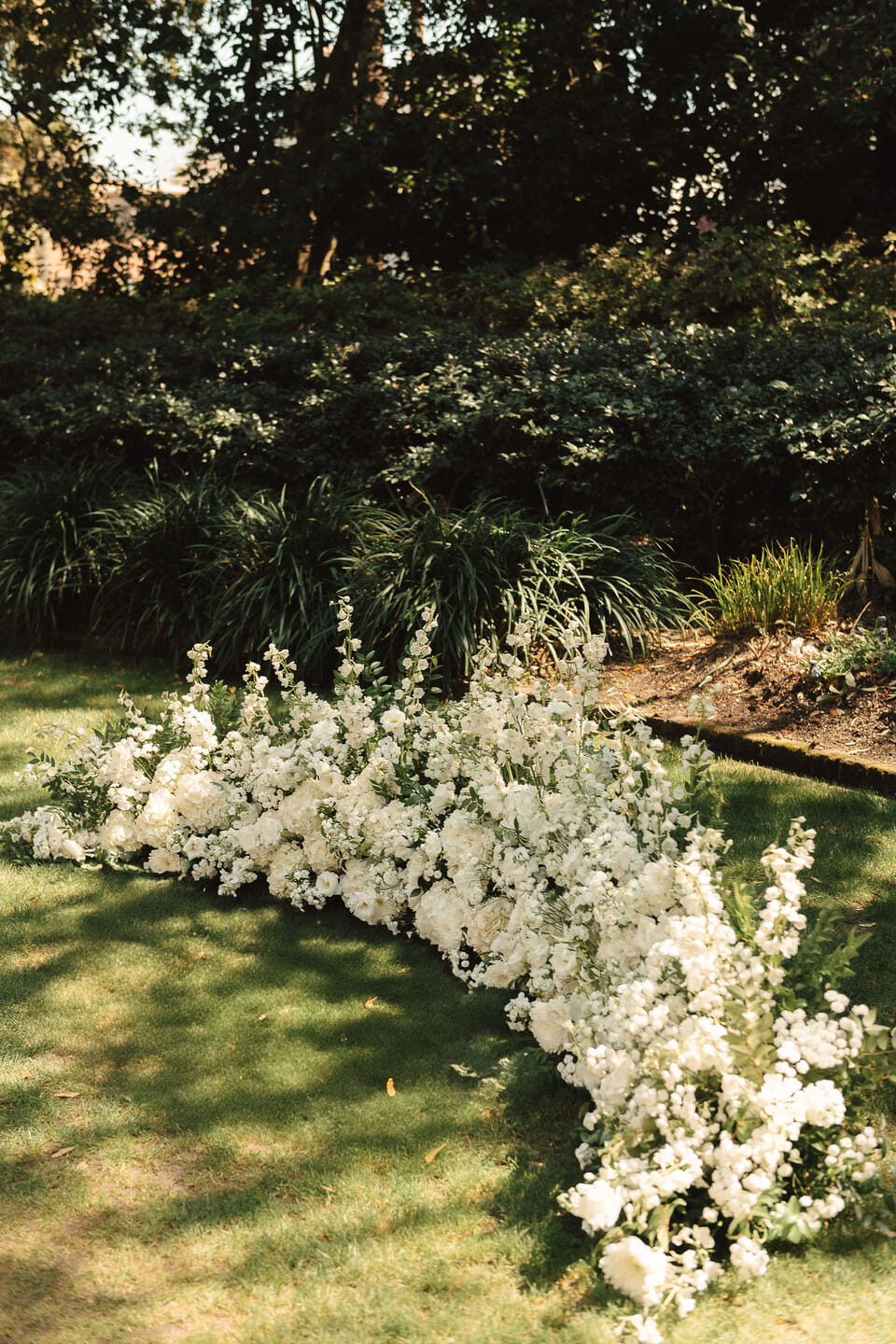 The palette unfolded in soft whites and elegant neutrals, echoing the home’s timeless façade. White peonies and delicate florals adorned the garden, while hanging flower baskets along the balconies added romantic softness. Reagan’s bouquet of pure white peonies, tied with a sentimental photo charm, introduced a meaningful personal detail, thoughtfully designed by 3 Peonies Weddings & Events.