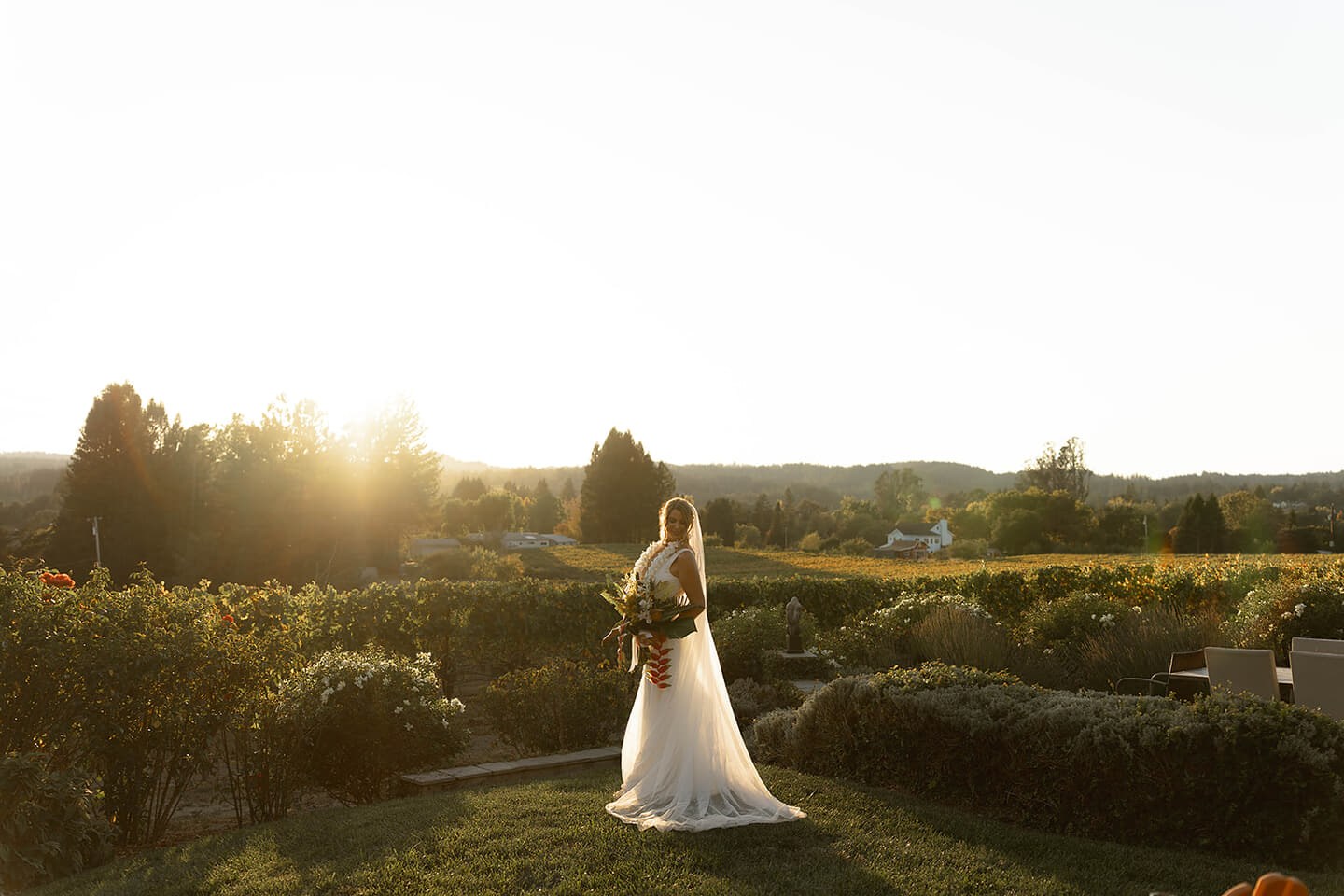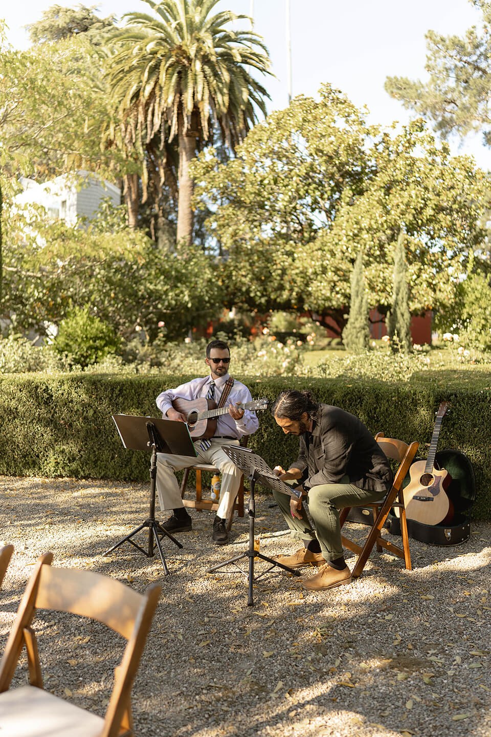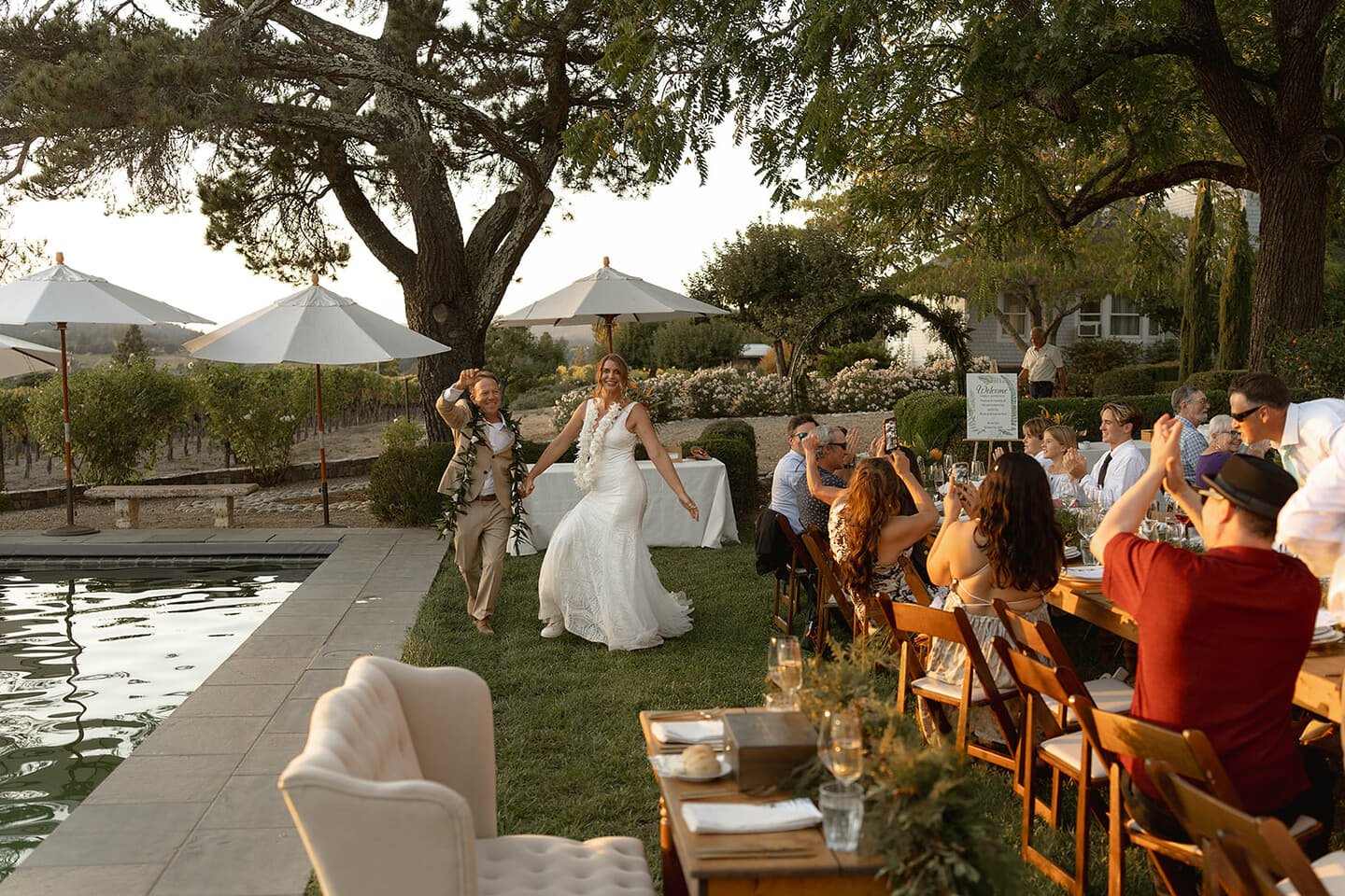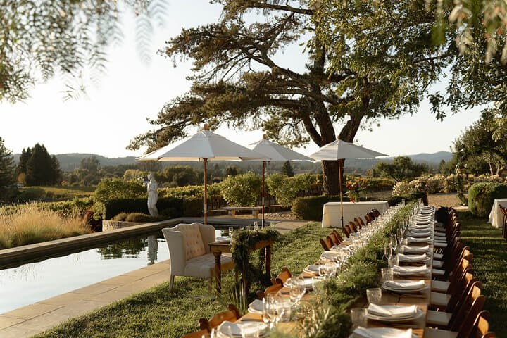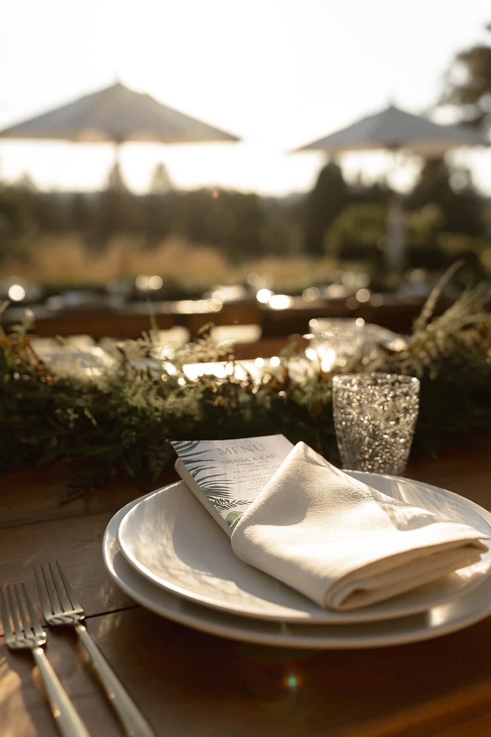 Long wooden tables dressed in dense greenery runners, vivid blooms, and golden accents set the tone for an elevated “tropical meets Sonoma” aesthetic. Guests savored a curated menu by Pascaline Fine Catering, warm acoustic music, and an atmosphere glowing beneath sunset lighting by Party, Tent & Event Rentals. Onyx & Arrow captured the day with cinematic depth, framing the couple in golden October light and lush garden layers.