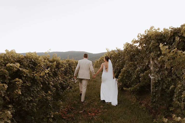 Cat and Jesse’s August wedding was cloaked in casual, chic modern love. The couple embraced the romantic Veritas Vineyard setting, welcoming guests to a sun-drenched late summer afternoon ceremony where they stood just the two of them against the warm countryside backdrop. An acoustic guitar brought the couple down the manicured aisle, the groom in a stylish contemporary sand-hued suit sans tie and the bride floating in a form-fitting gown trailed by a jeweled fairytale veil.