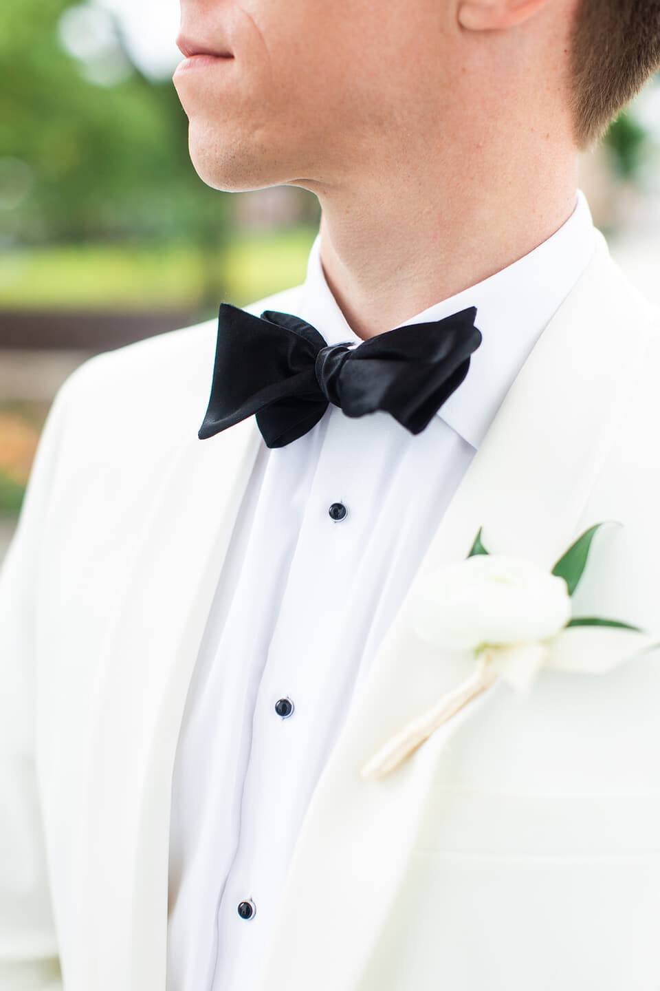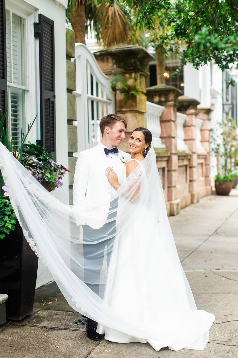 On a radiant spring day in May, Rachel and Schafer celebrated their wedding at the historic South Carolina Society Hall, where soaring chandeliers, white walls, and timeless architectural details created a breathtaking Charleston backdrop. Rachel was the picture of classic elegance in a white gown with a sweeping train and lace-edged veil, her look completed by Silhouette On Site, who styled her with refined grace. She carried a lush bouquet of white roses and greenery designed by Pretty Petals of Charleston, perfectly complementing Schafer’s crisp white dinner jacket and black bow tie—a timeless pairing that echoed the city’s genteel charm.