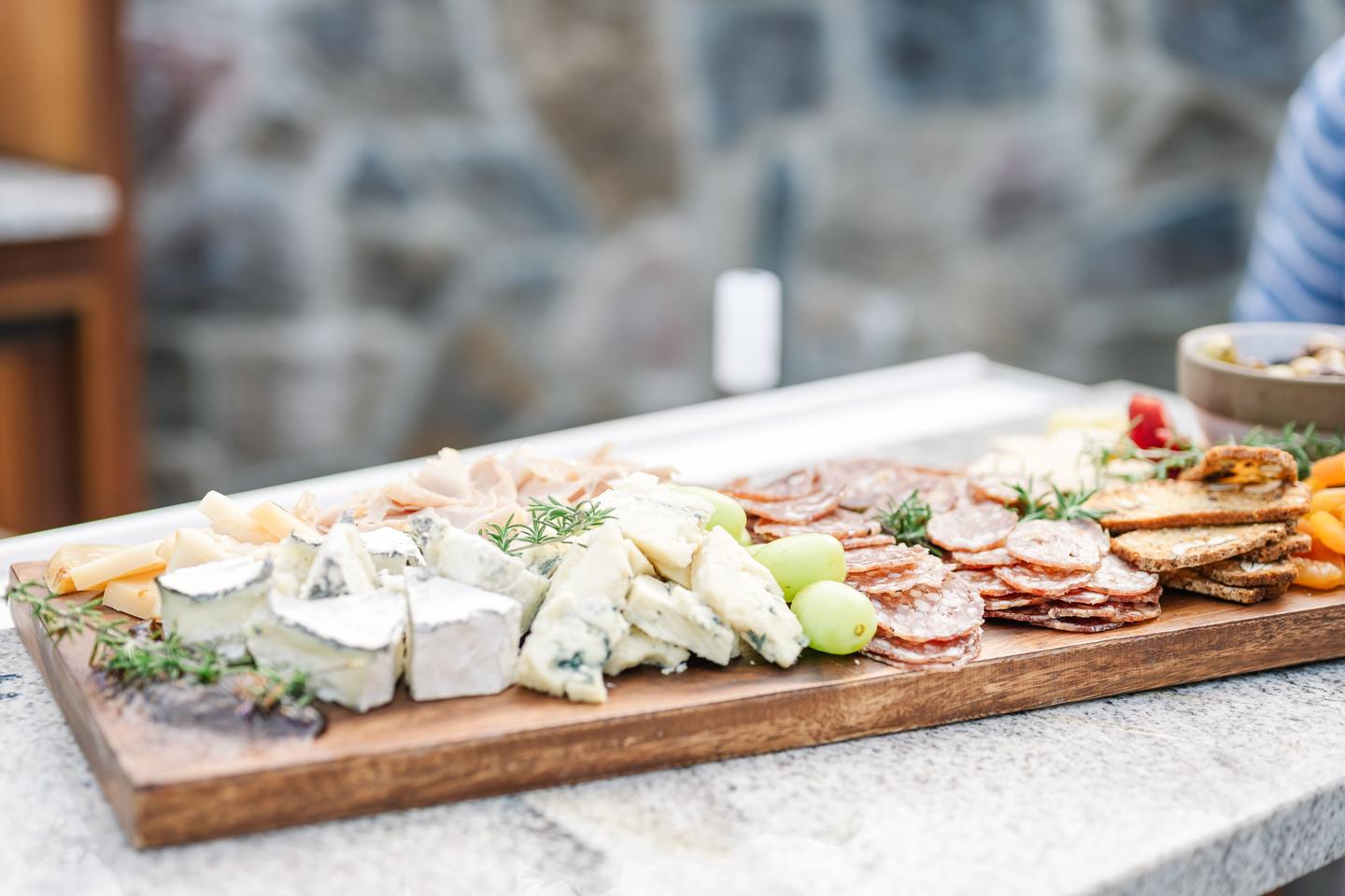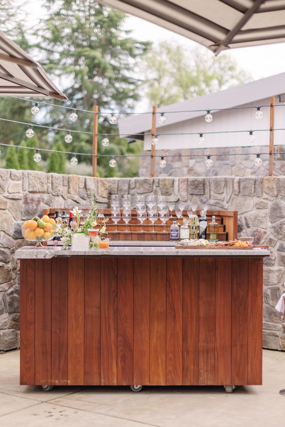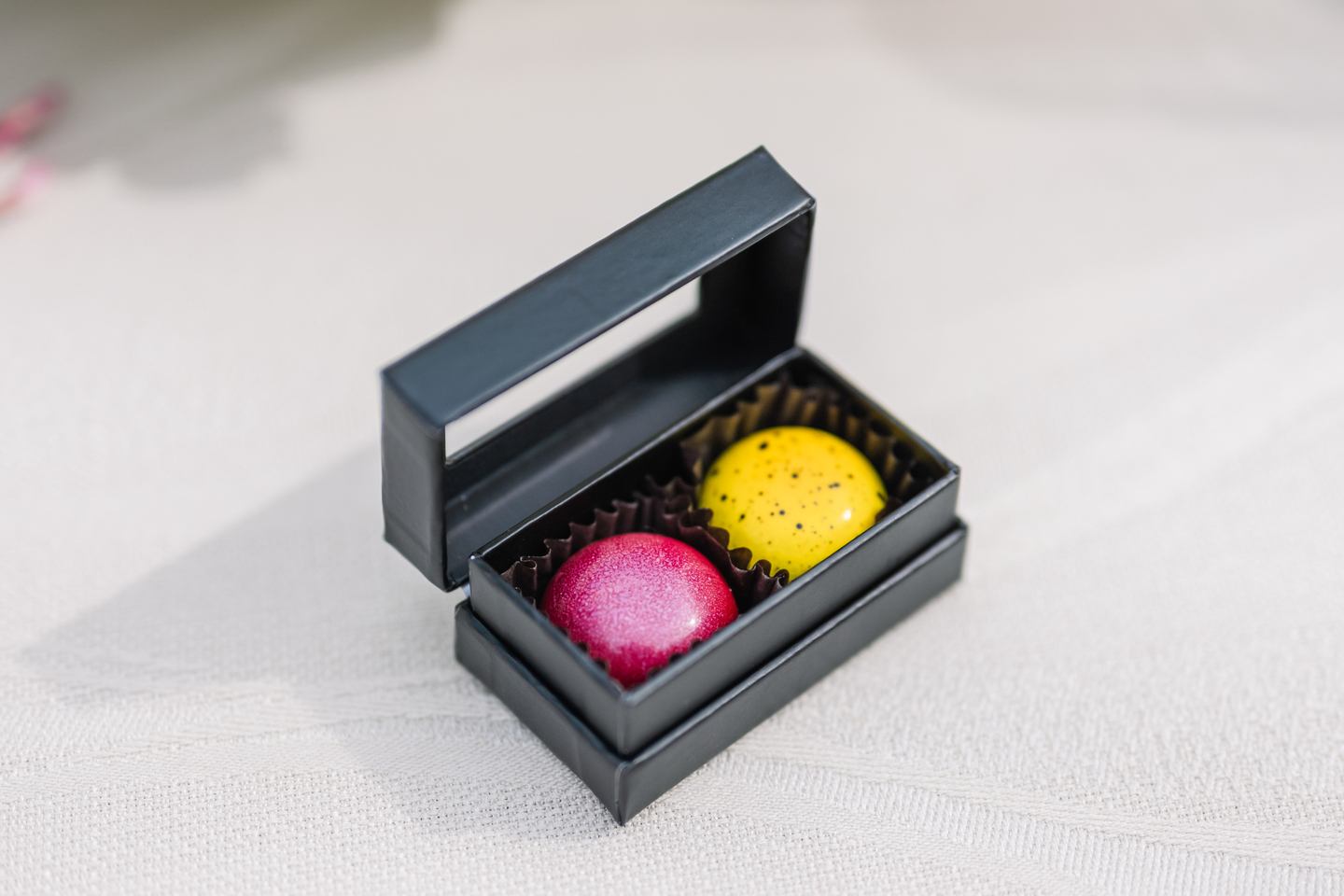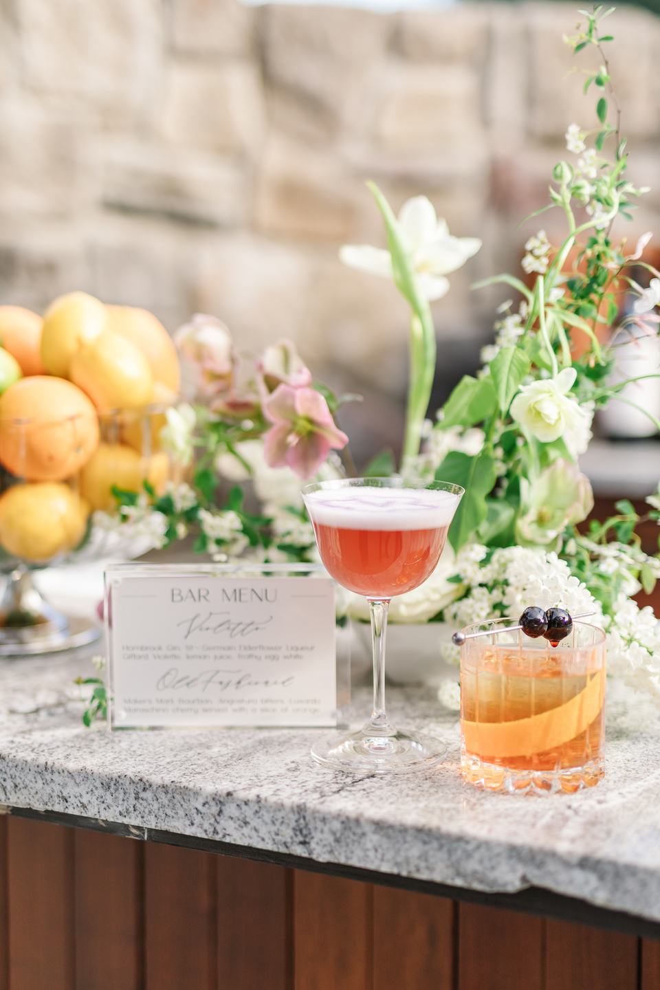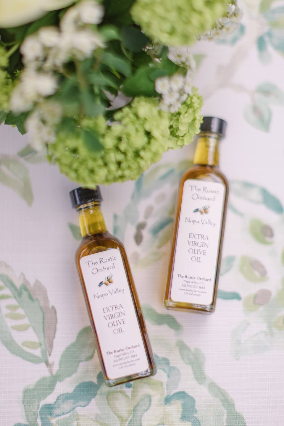The reception concept continues this refined narrative with layered details. Tables are styled with lush centerpieces in white and pale green by EV Floral Design, paired with elegant linens from Napa Valley Linens. A two-tier white cake by MM Cake Company, finished with textured frosting and soft peach and white sugar flowers, serves as a focal point. Custom cocktails nod to the vineyard’s Napa roots, while bottles of local extra virgin olive oil from The Rustic Orchard and artisanal chocolates from Kollar Chocolates are imagined as thoughtful guest favors.