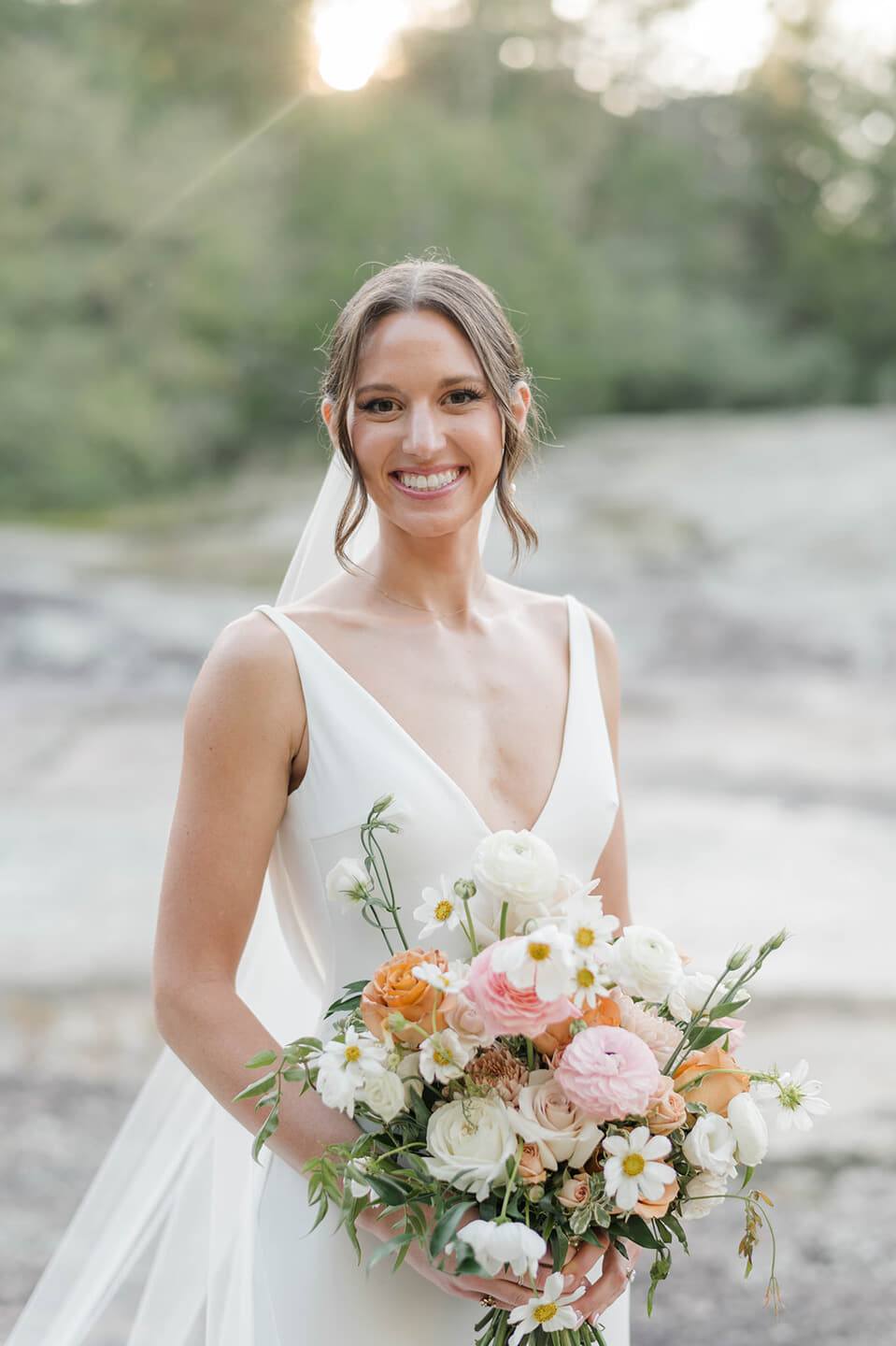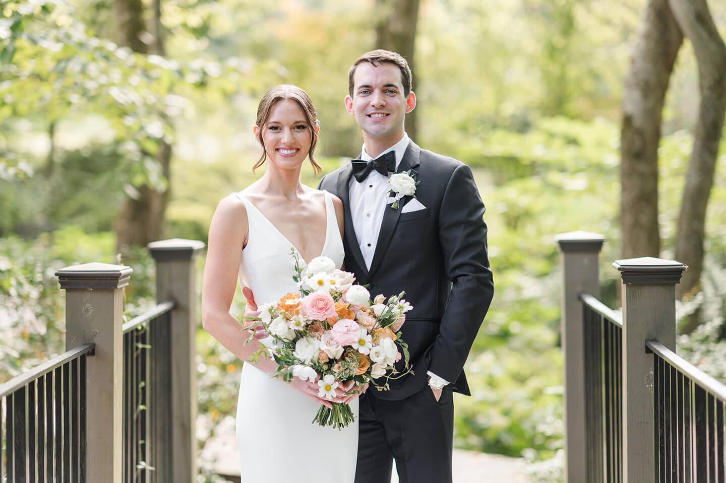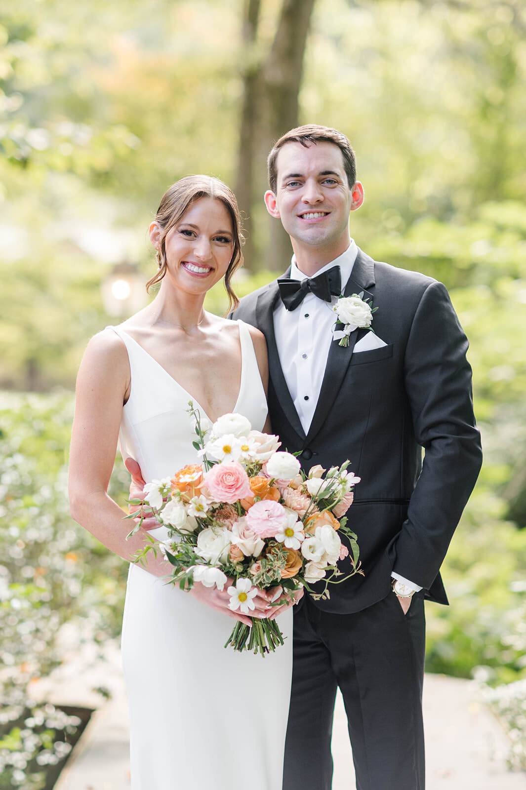 Weddings by Vogue designed stunning, organic floral arrangements of ranunculus, roses, daisies, and greenery that beautifully echoed the season’s warmth. The ceremony unfolded outdoors against a stone wall framed by greenery, creating a romantic backdrop for their vows. Julia was radiant in a white slip-style gown with a sweeping train, while her bridesmaids in blush dresses completed the refined palette. Matt’s classic black tuxedo and bow tie added a note of timeless sophistication.