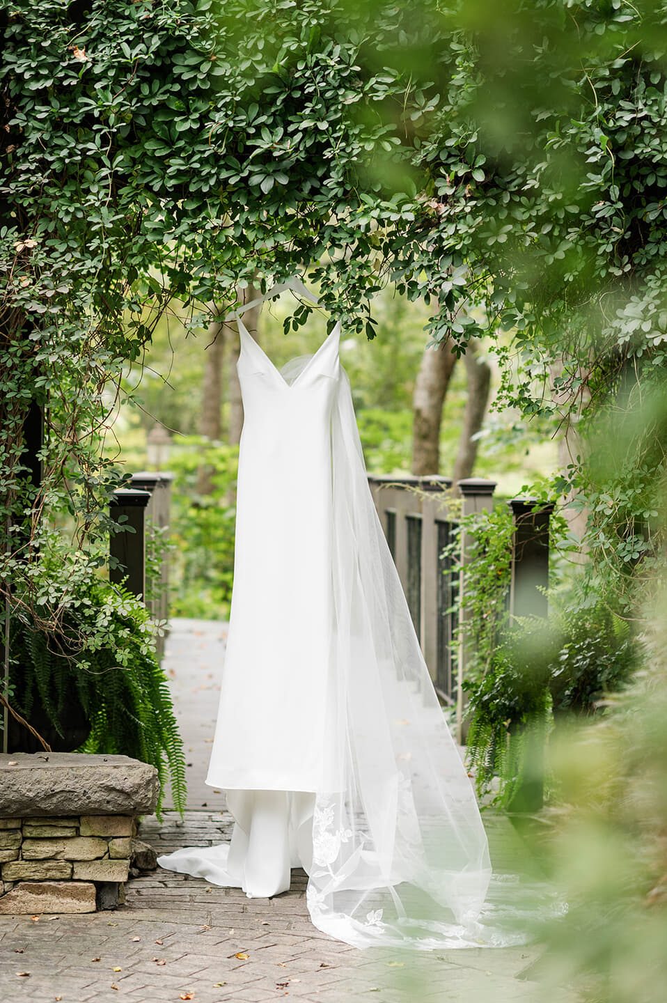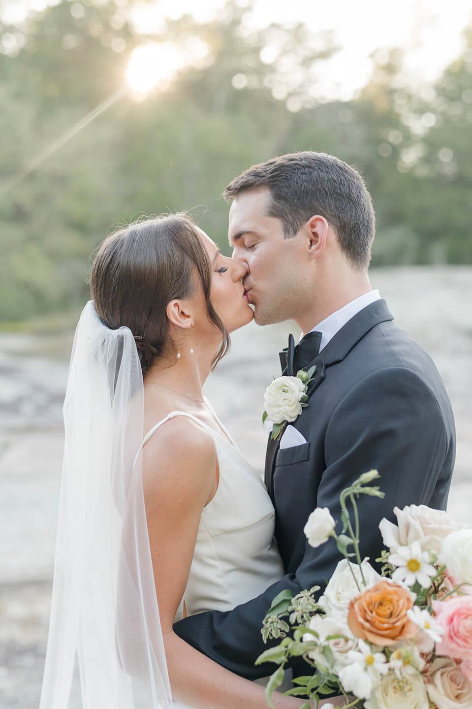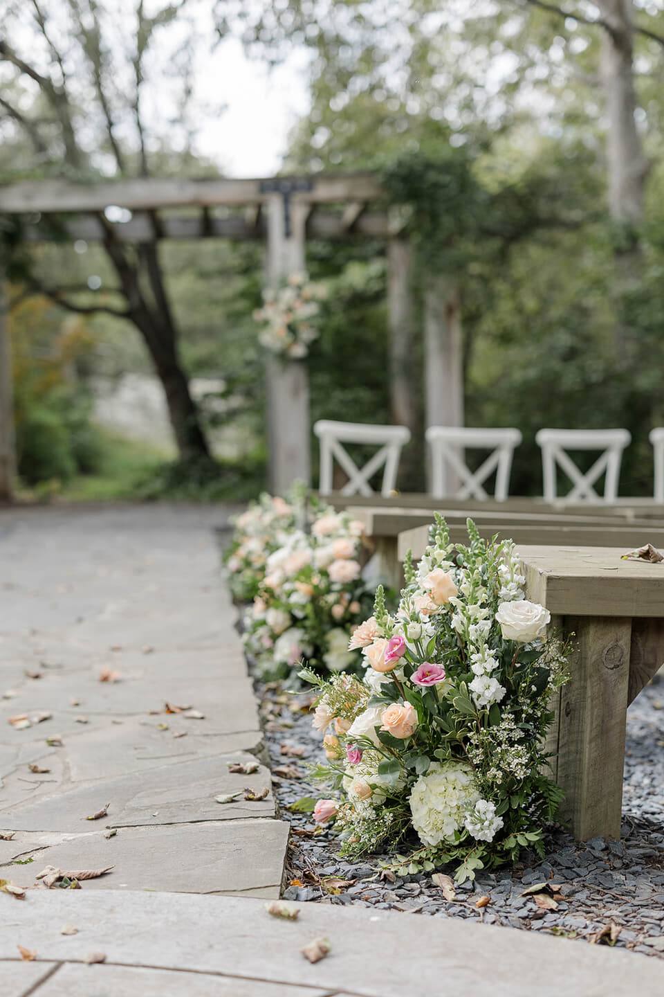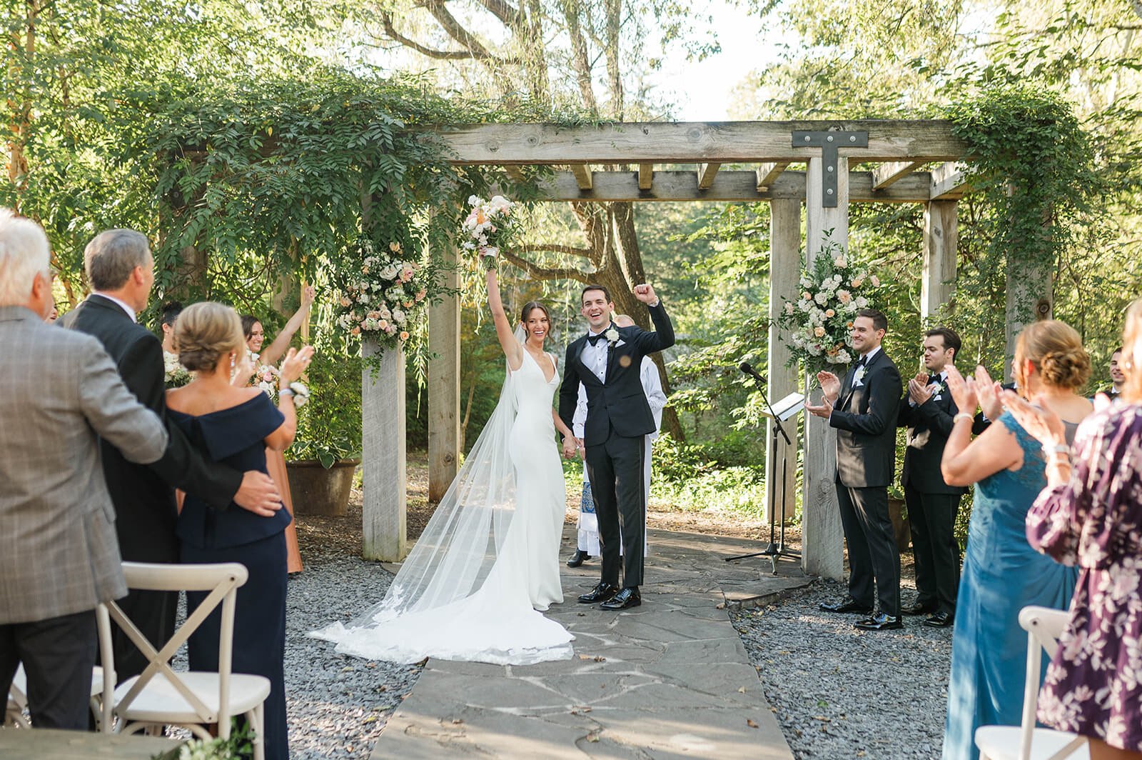 Weddings by Vogue designed stunning, organic floral arrangements of ranunculus, roses, daisies, and greenery that beautifully echoed the season’s warmth. The ceremony unfolded outdoors against a stone wall framed by greenery, creating a romantic backdrop for their vows. Julia was radiant in a white slip-style gown with a sweeping train, while her bridesmaids in blush dresses completed the refined palette. Matt’s classic black tuxedo and bow tie added a note of timeless sophistication.