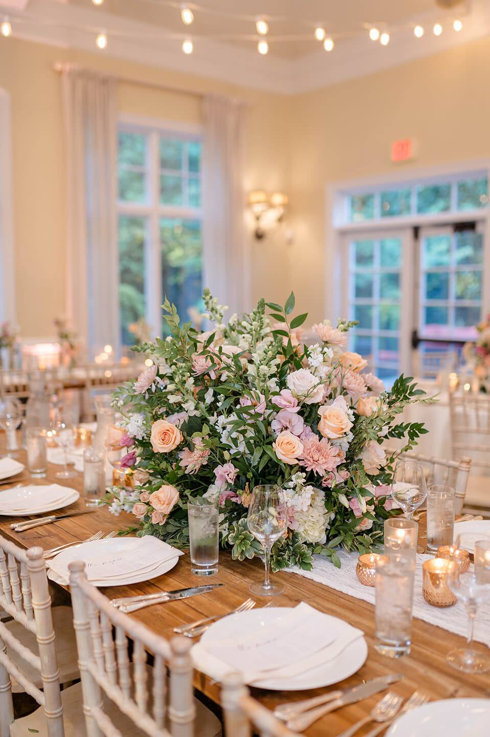 As the evening transitioned to the reception, natural light streamed through the venue’s large windows while string lights and candles cast a warm glow. Wooden farmhouse tables dressed with gold-rimmed chargers and delicate florals created an inviting, refined atmosphere. Guests dined on a menu by Fine Creek Provisions, and a two-tier white cake adorned with fresh flowers provided a sweet finish to the celebration. Brittany Lowe Photography portrayed the day with soft, luminous artistry, preserving the quiet romance and natural elegance of the Virginia countryside.