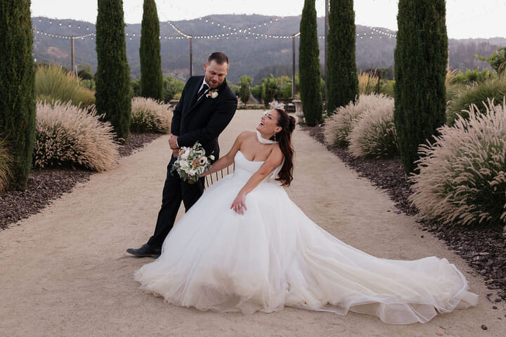 As evening settled in, string lights glowed overhead and the celebration turned lively. Music filled the vineyard as guests danced beneath the stars, capturing the joyful energy that defined the day. Mackenzie Elayne Photo portrayed the celebration with an editorial eye, preserving the romance, movement, and effortless beauty woven throughout Lily and Nick’s wedding. The result was a joyful, elegant celebration that felt timeless and deeply connected to the natural beauty of Napa Valley.