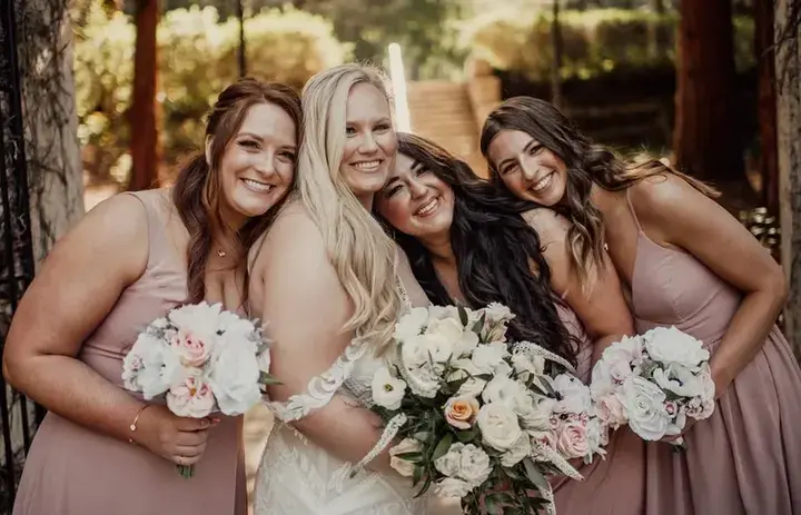 The ceremony aisle was framed by lush floral installations from Sonoma Flowers, layered with blush, peach, and white roses, soft blue delphiniums, and abundant greenery that created a romantic, garden-inspired atmosphere. Lily’s bridal look echoed the elegance of the setting. She wore a strapless tulle ball gown paired with pearl-accented heels and a bouquet of white and blush roses with eucalyptus and seasonal foliage.