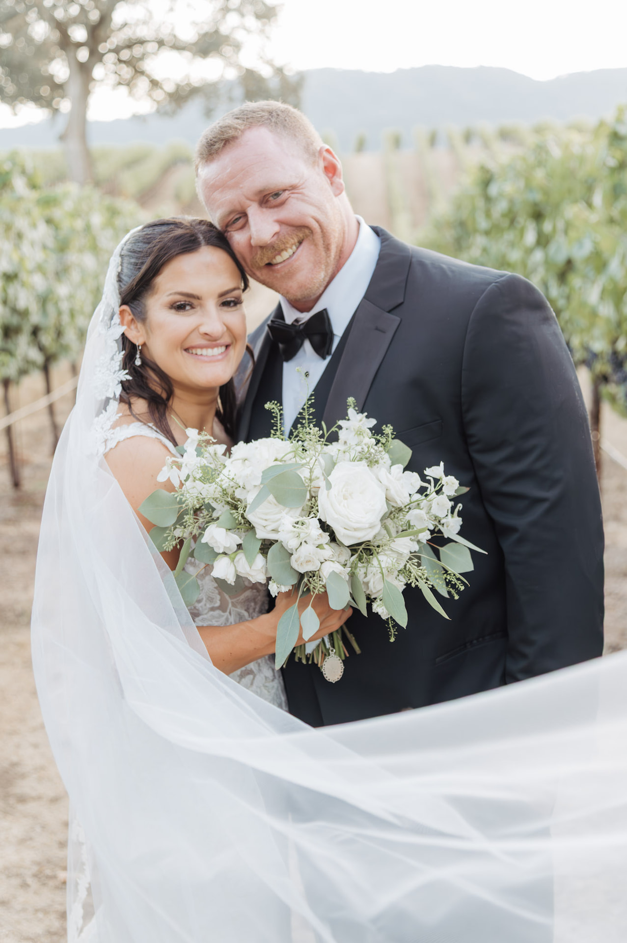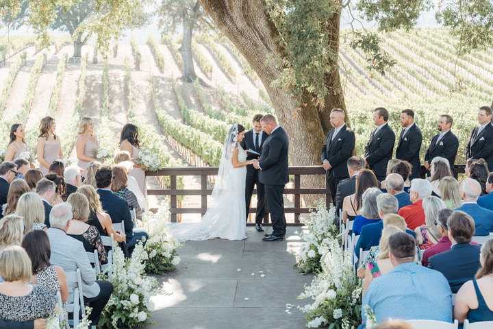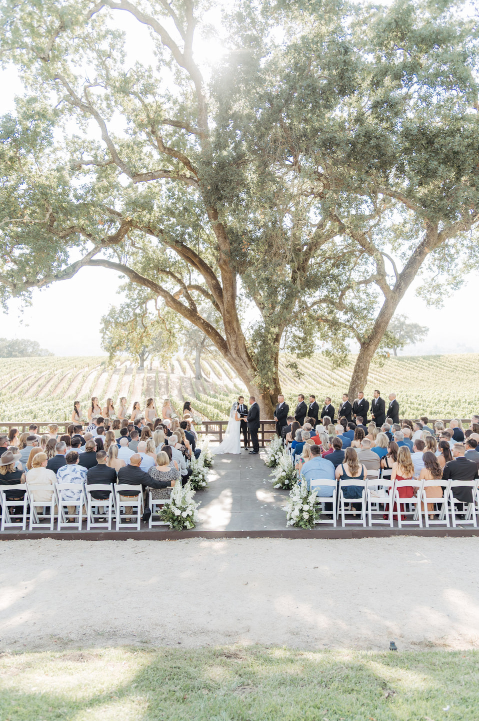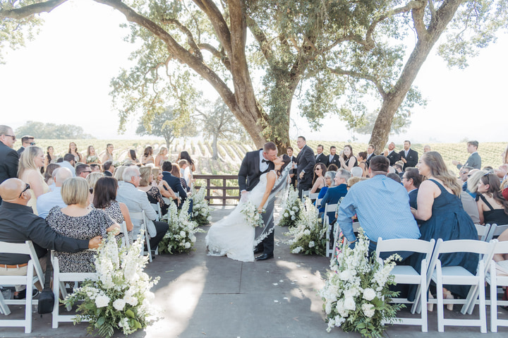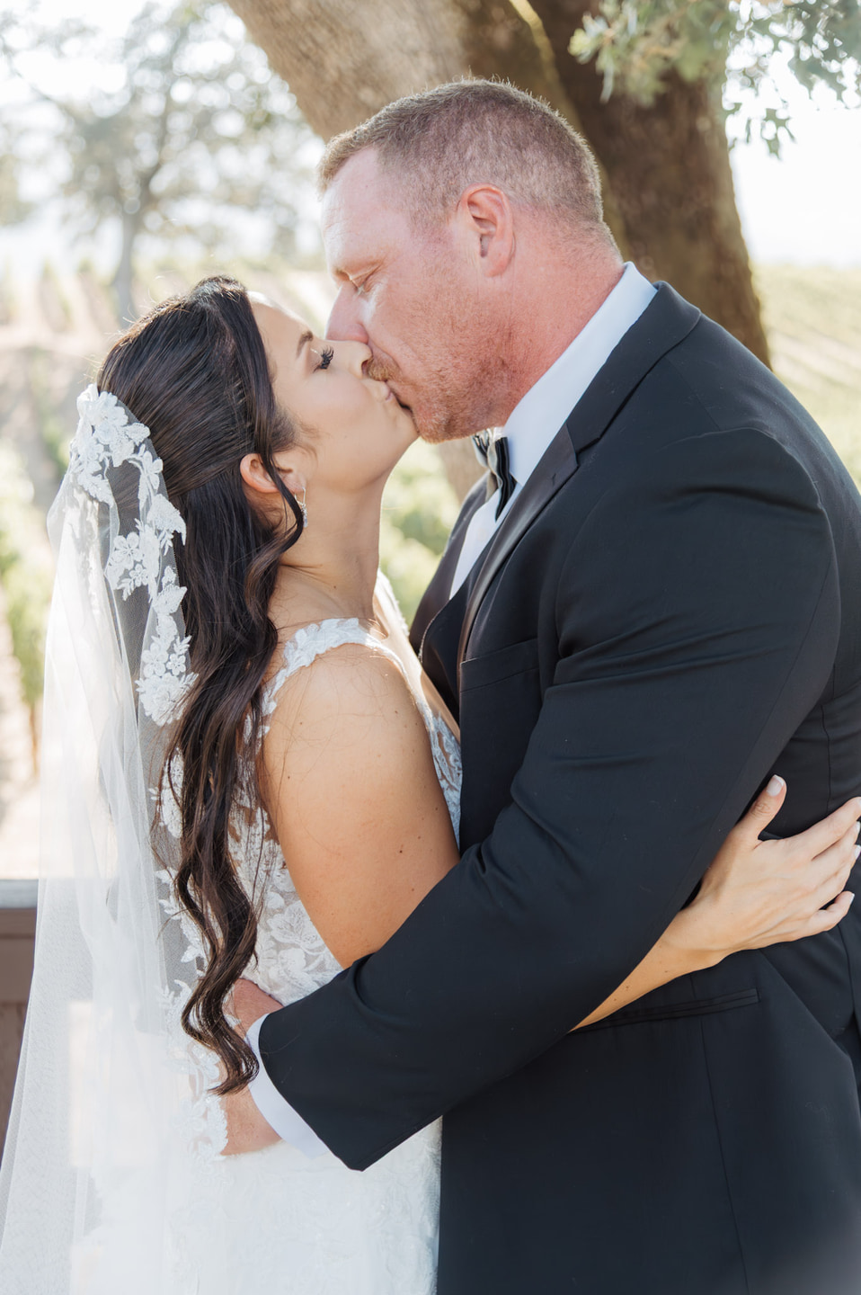 Lush eucalyptus and white roses designed by Julie Stevens Design softened the landscape with organic refinement. Aly wore a lace mermaid gown with an illusion neckline and sweeping train that moved beautifully through the vineyard during portraits. The ceremony took place in the winery’s amphitheater, framed by Cabernet Sauvignon vines and Sonoma Mountain views, where chairs lined a floral-accented aisle beneath a canopy of mature oaks.