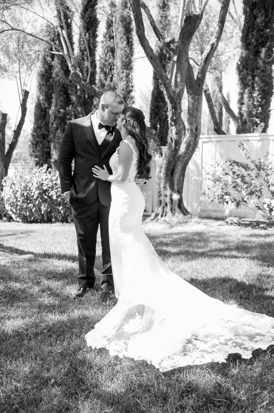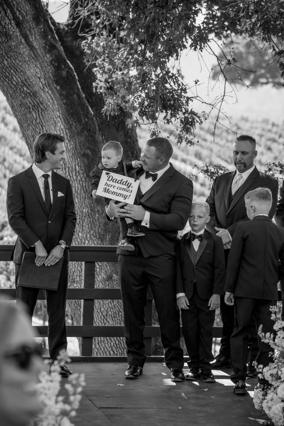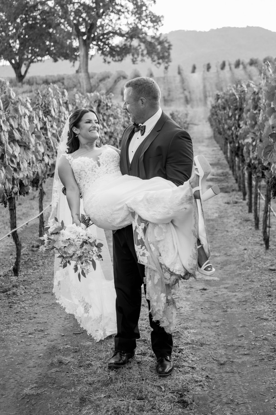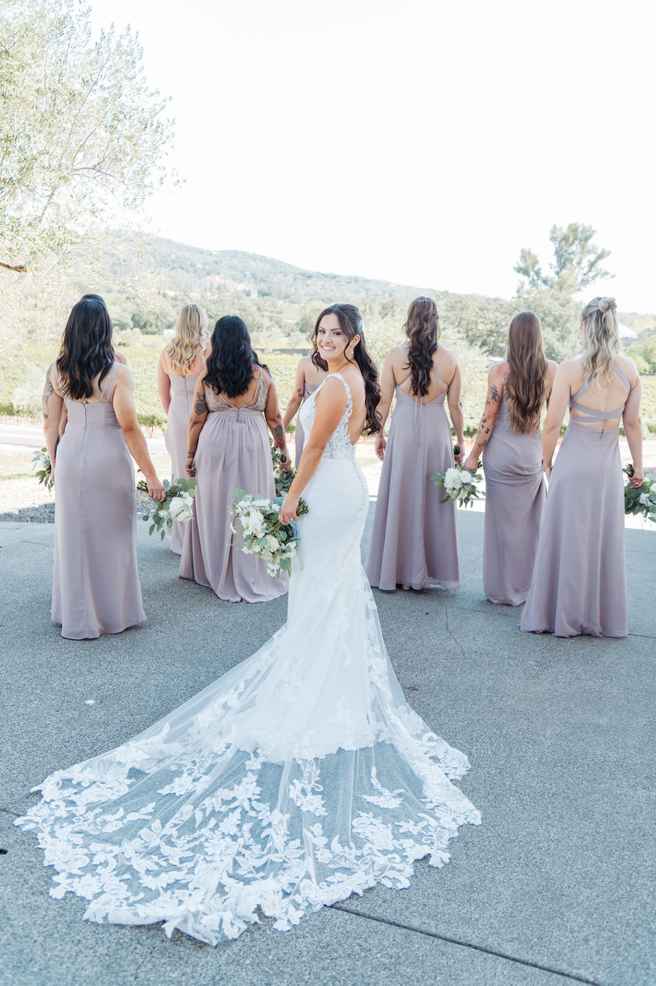 Lush eucalyptus and white roses designed by Julie Stevens Design softened the landscape with organic refinement. Aly wore a lace mermaid gown with an illusion neckline and sweeping train that moved beautifully through the vineyard during portraits. The ceremony took place in the winery’s amphitheater, framed by Cabernet Sauvignon vines and Sonoma Mountain views, where chairs lined a floral-accented aisle beneath a canopy of mature oaks.
