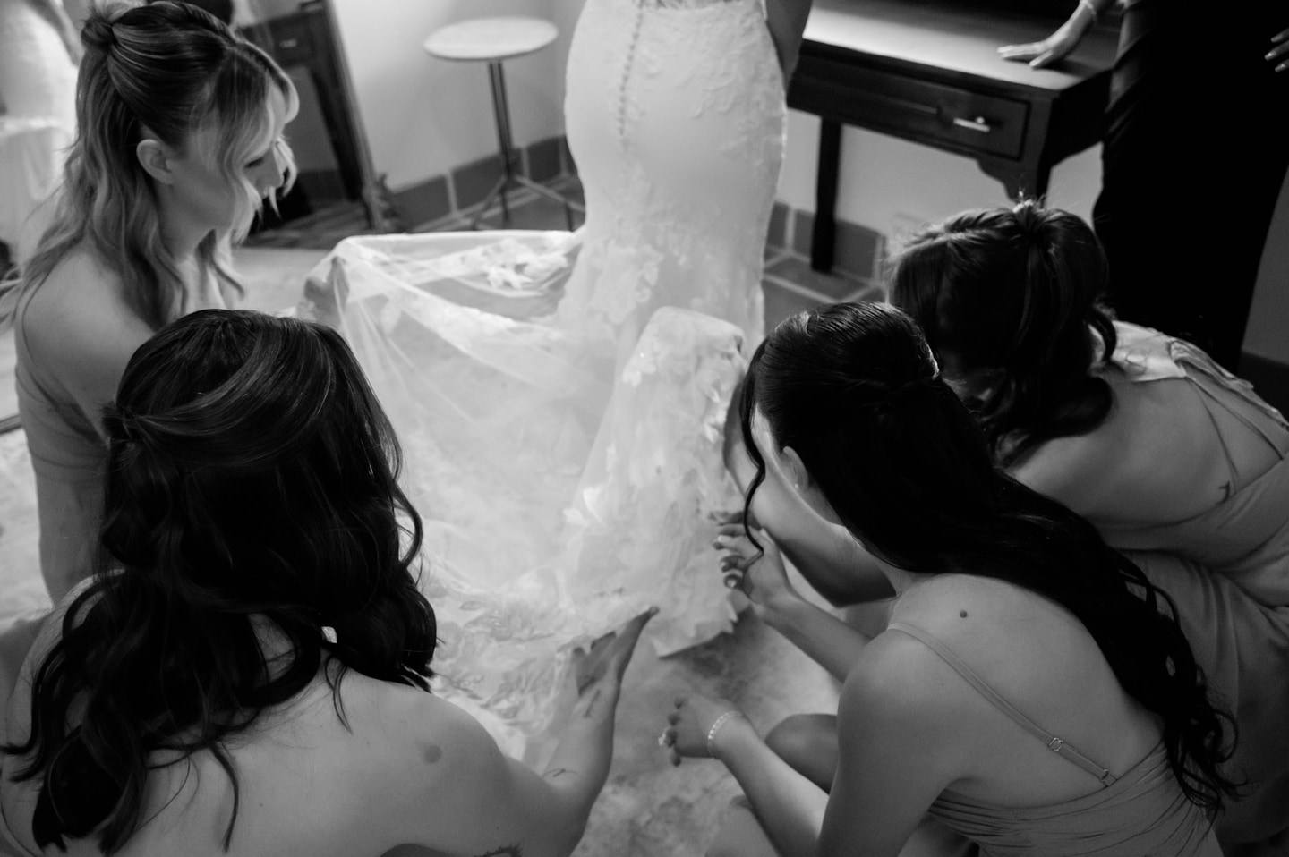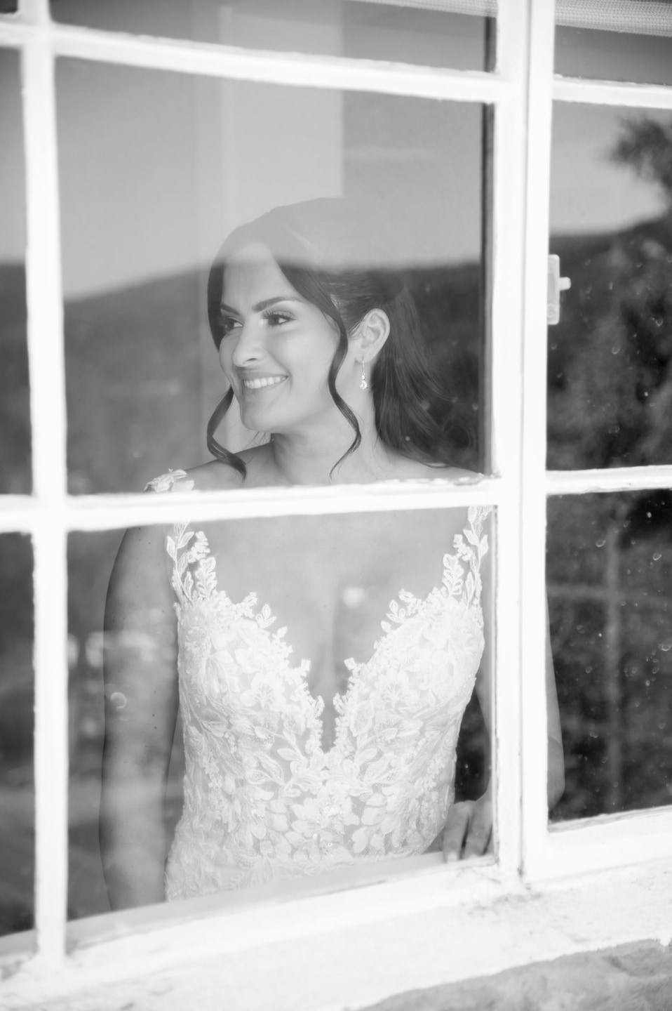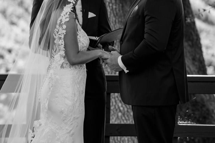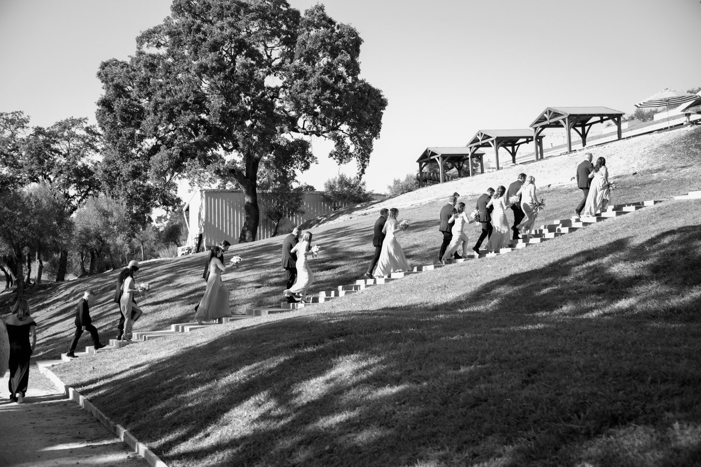 Lush eucalyptus and white roses designed by Julie Stevens Design softened the landscape with organic refinement. Aly wore a lace mermaid gown with an illusion neckline and sweeping train that moved beautifully through the vineyard during portraits. The ceremony took place in the winery’s amphitheater, framed by Cabernet Sauvignon vines and Sonoma Mountain views, where chairs lined a floral-accented aisle beneath a canopy of mature oaks.
