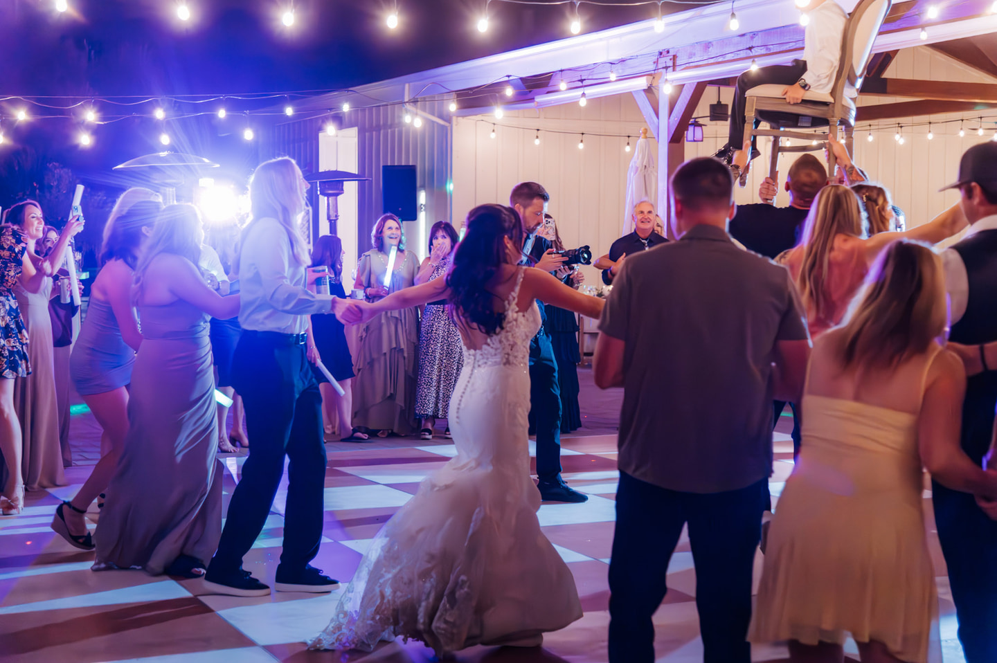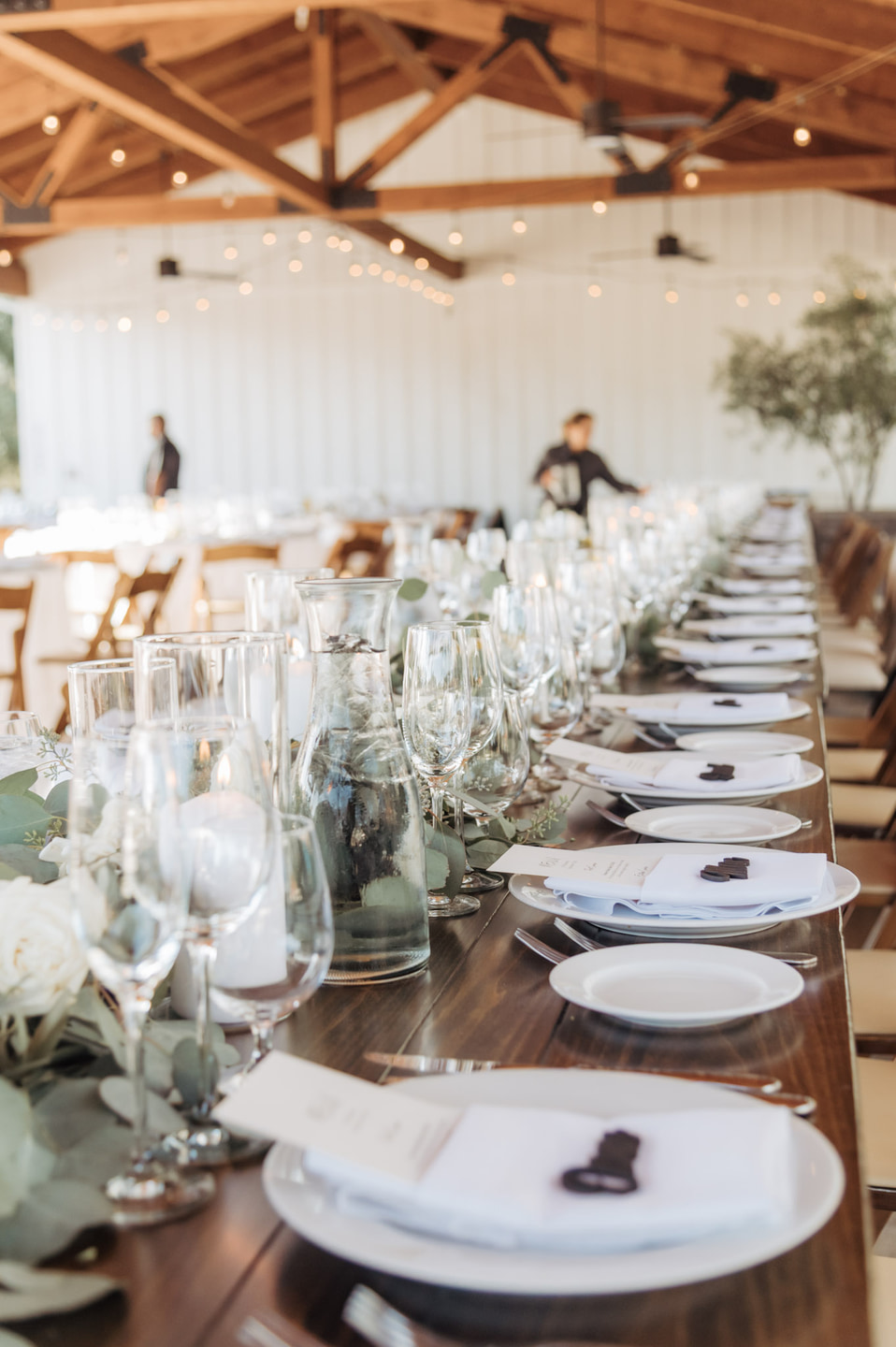 The celebration continued in the open-air barn, where wooden farm tables were styled with greenery runners, classic white plates, and elegant glassware glowing in late-summer light. Park Avenue Catering highlighted seasonal California flavors, while custom cocktails reflected the couple’s personality. Thoughtfully orchestrated by Quintana Events, the day flowed with ease from start to finish.