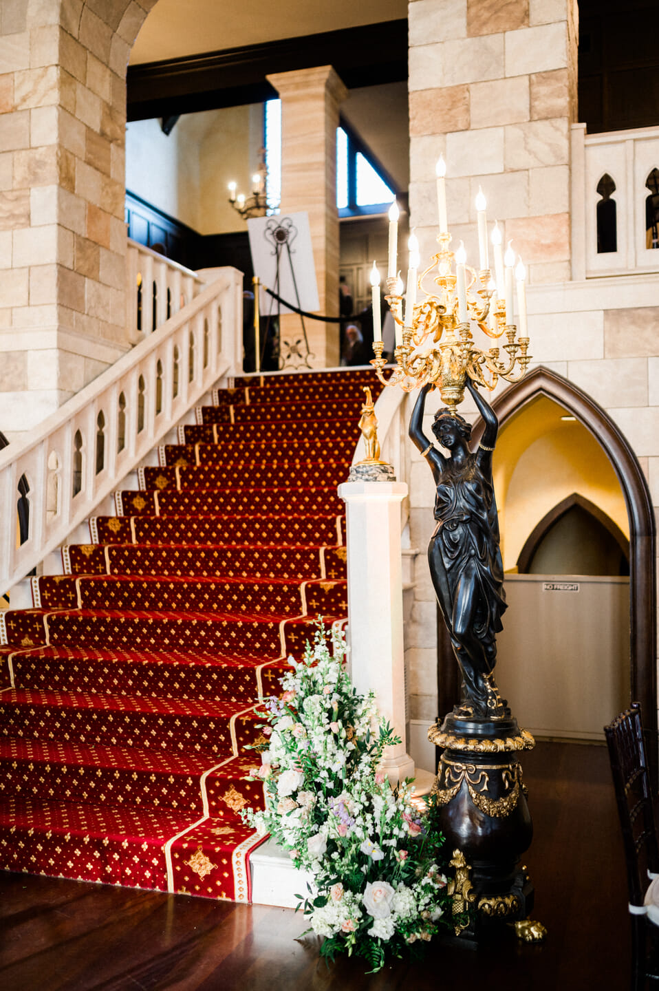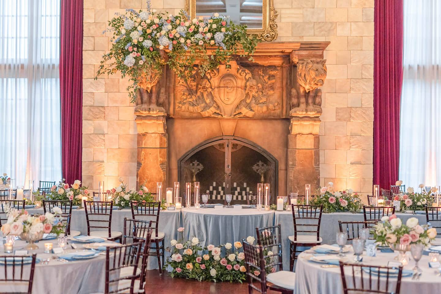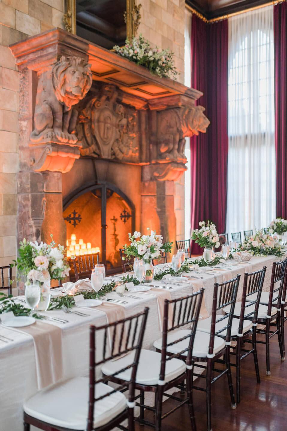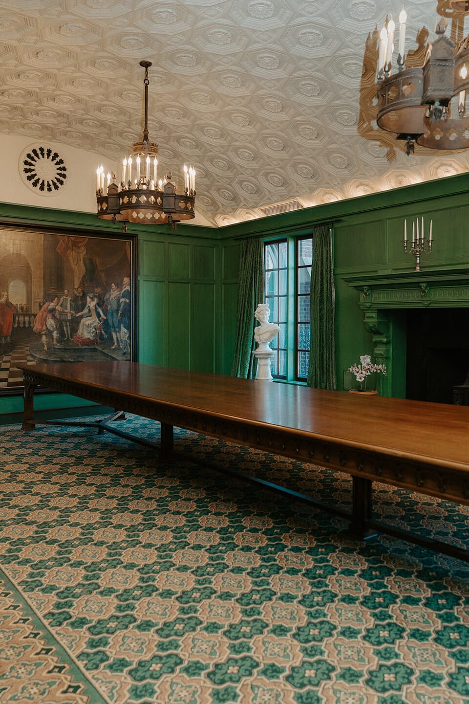 With its medieval-inspired architecture, the estate transports you to the English countryside, featuring hand-carved tables, exquisite furnishings, and stunning event spaces like the Formal Dining Room, Solarium, Library, and Billiards Room. The grand Ballroom, with its wood-coffered ceilings and wrought iron chandeliers, opens onto the Bluestone Terrace, offering breathtaking views. Outside, the Two-Tiered Gardens, Rose Garden, Cobblestone Court, and Reflection Pool create picture-perfect settings for ceremonies, receptions, and portraits.