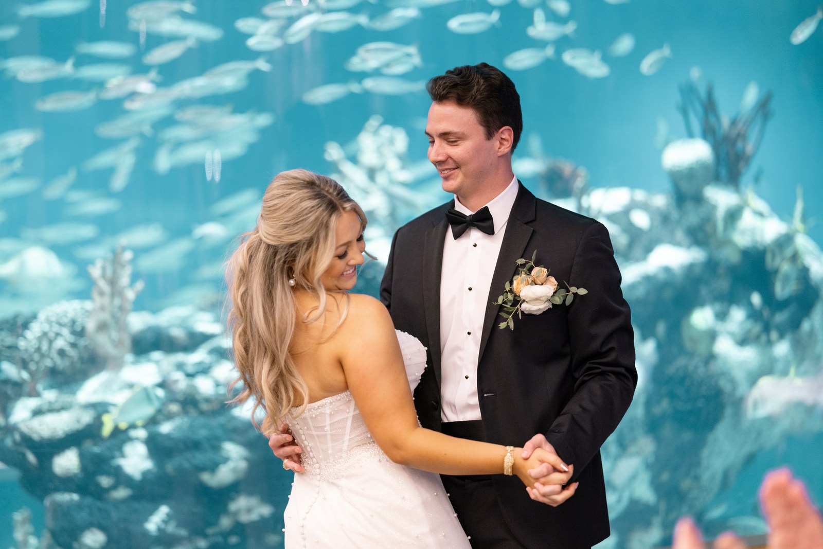 The South Carolina Aquarium, set along Charleston Harbor in downtown Charleston, offers panoramic waterfront views, striking floor-to-ceiling architecture, and immersive aquatic exhibits creating a wedding setting that is both elegant and uniquely vibrant.