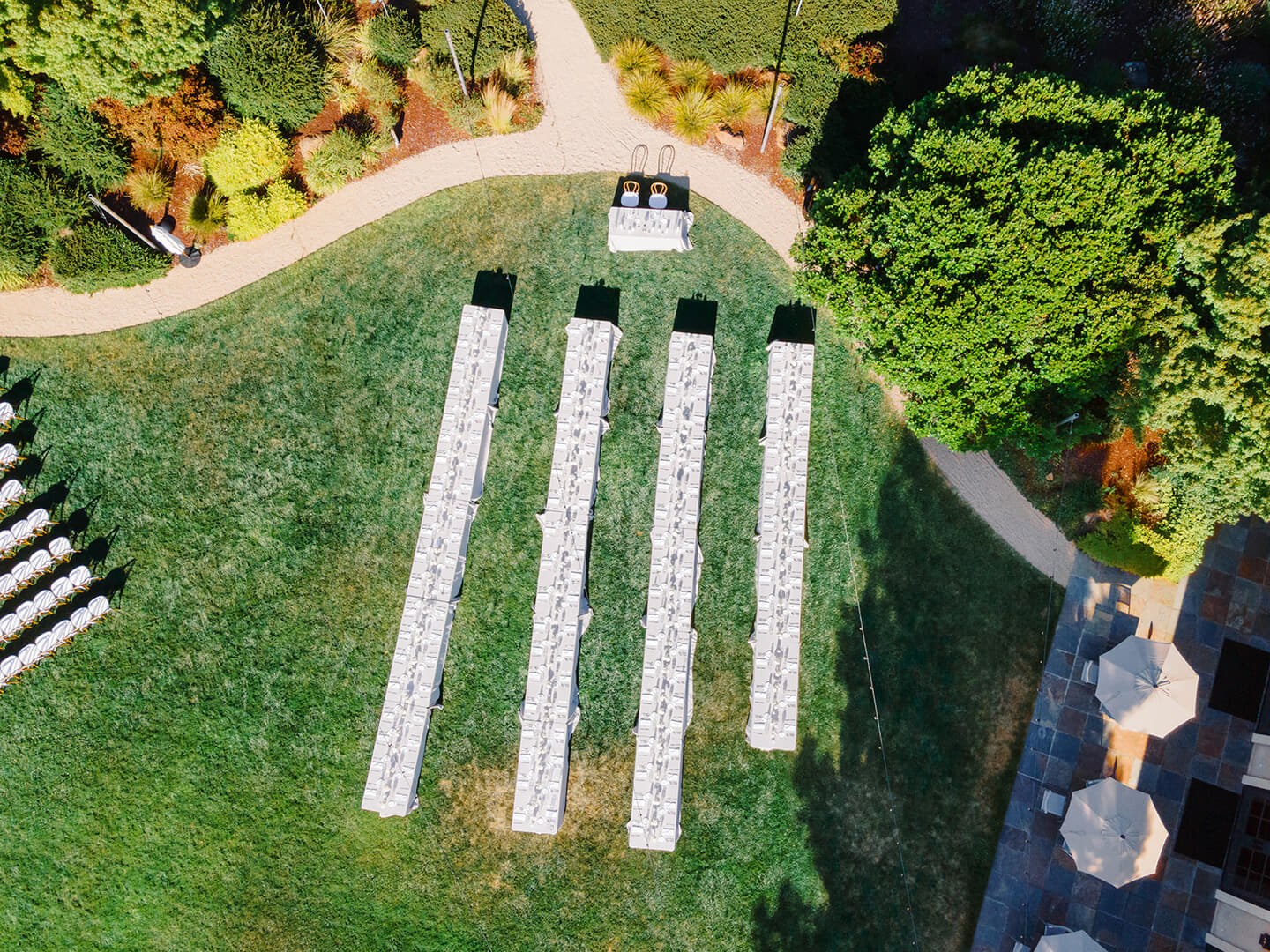 - Market lights over the Great Lawn, fairy lights in the reception dining room, overhead heaters at the Vineyard Portico, and on-site A/V equipment.