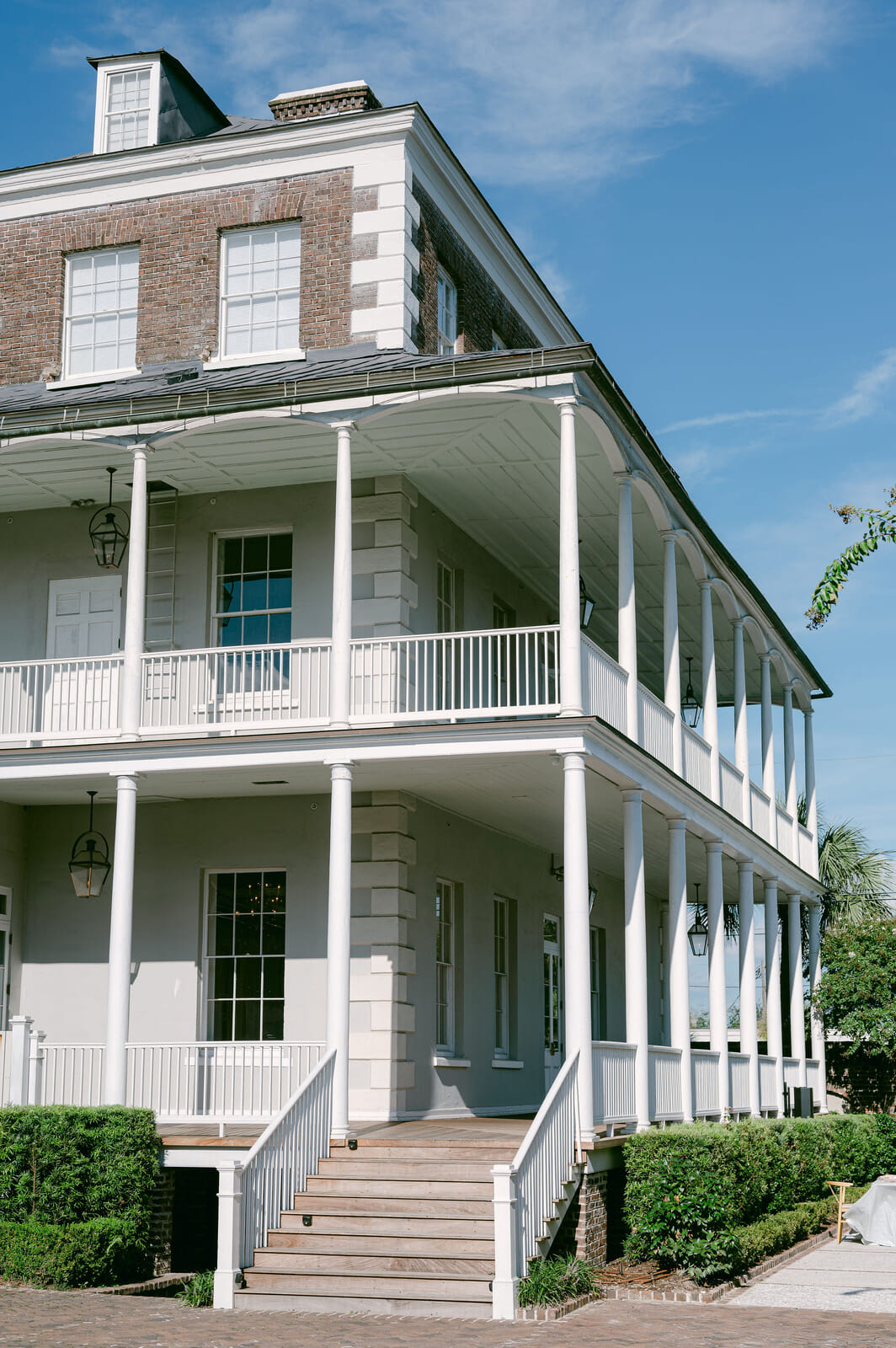 Inside, grand parlor rooms showcase Federal-style architecture, original heart pine floors, soaring windows, and sparkling crystal chandeliers. The light-filled interiors open onto expansive Southern piazzas adorned with gas lanterns and “haint blue” ceilings, overlooking lush courtyard gardens filled with magnolias, crepe myrtles, and palm trees. Three intimate courtyards, framed by Charleston brick, bluestone, and oyster tabby, create an enchanting backdrop for outdoor ceremonies and receptions.