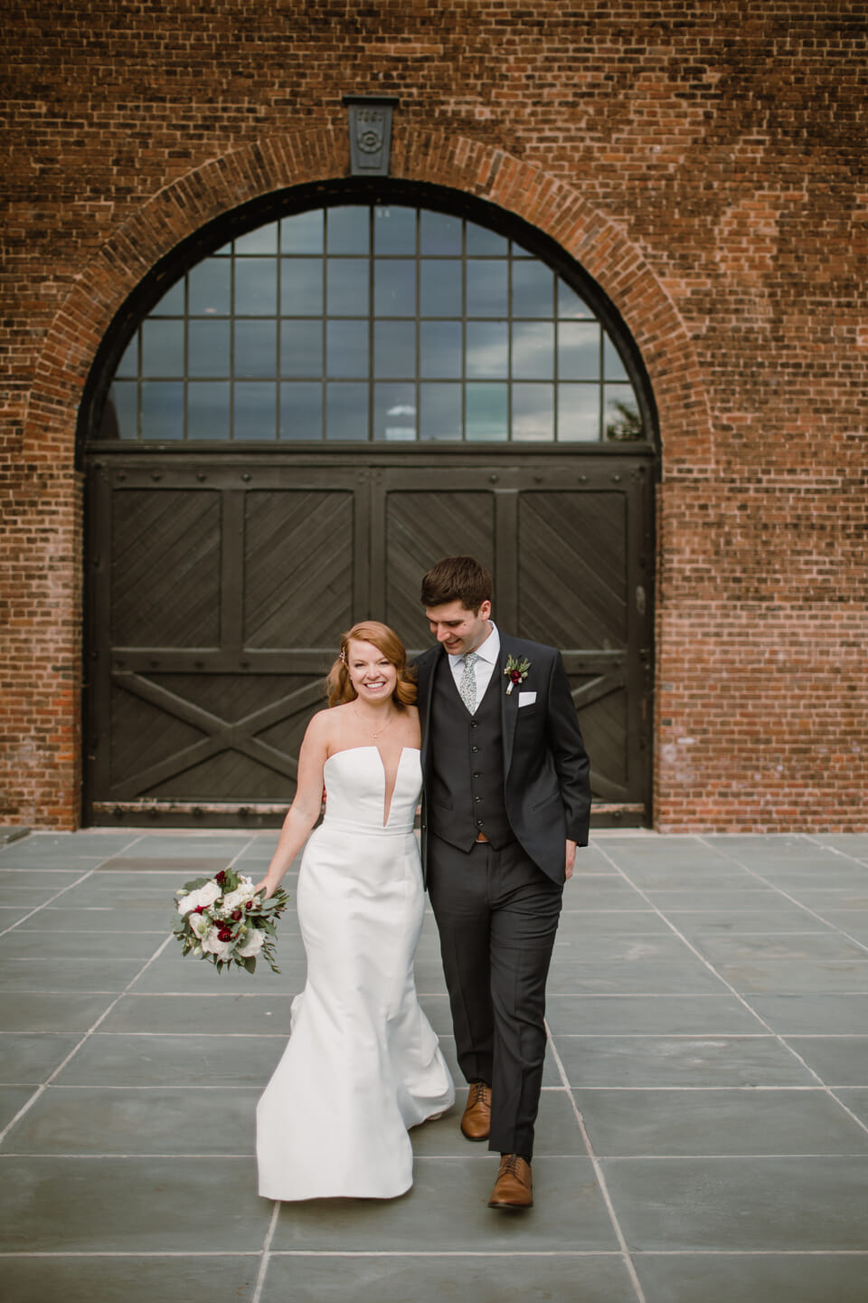 Located within the historic Tredegar Iron Works, a Civil War era landmark, the venue showcases towering brick facades, grand windows, and authentic 19th-century architectural details. Inside, a spacious open hall features rustic beams and dramatic brick walls, with oversized doors that invite in natural light. Outside, ceremonies unfold beneath ancient trees strung with lights, with the river serving as a stunning natural backdrop.